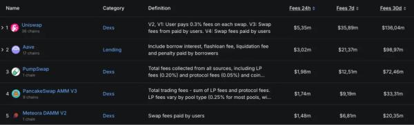Среди лидеров — Uniswap с доходом $136,04 млн за последние 30 дней и Aave с $98,97 млн.